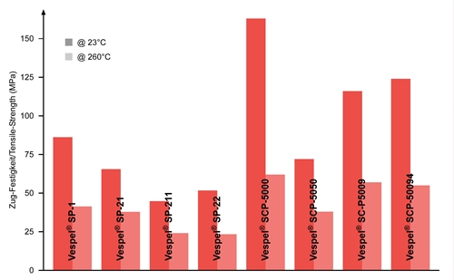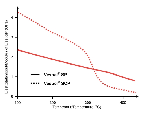 Das Vespel® SCP zeichnet sich im Vergleich zum Vespel® SP durch eine deutlich höhere mechanische Festigkeit über einen weiten Temperatureinsatzbereich aus. Bei Temperaturen bis über 250°C ist es den bisher bekannten Polyimiden überlegen. Erst oberhalb 300°C fällt die Festigkeit signifikant ab.